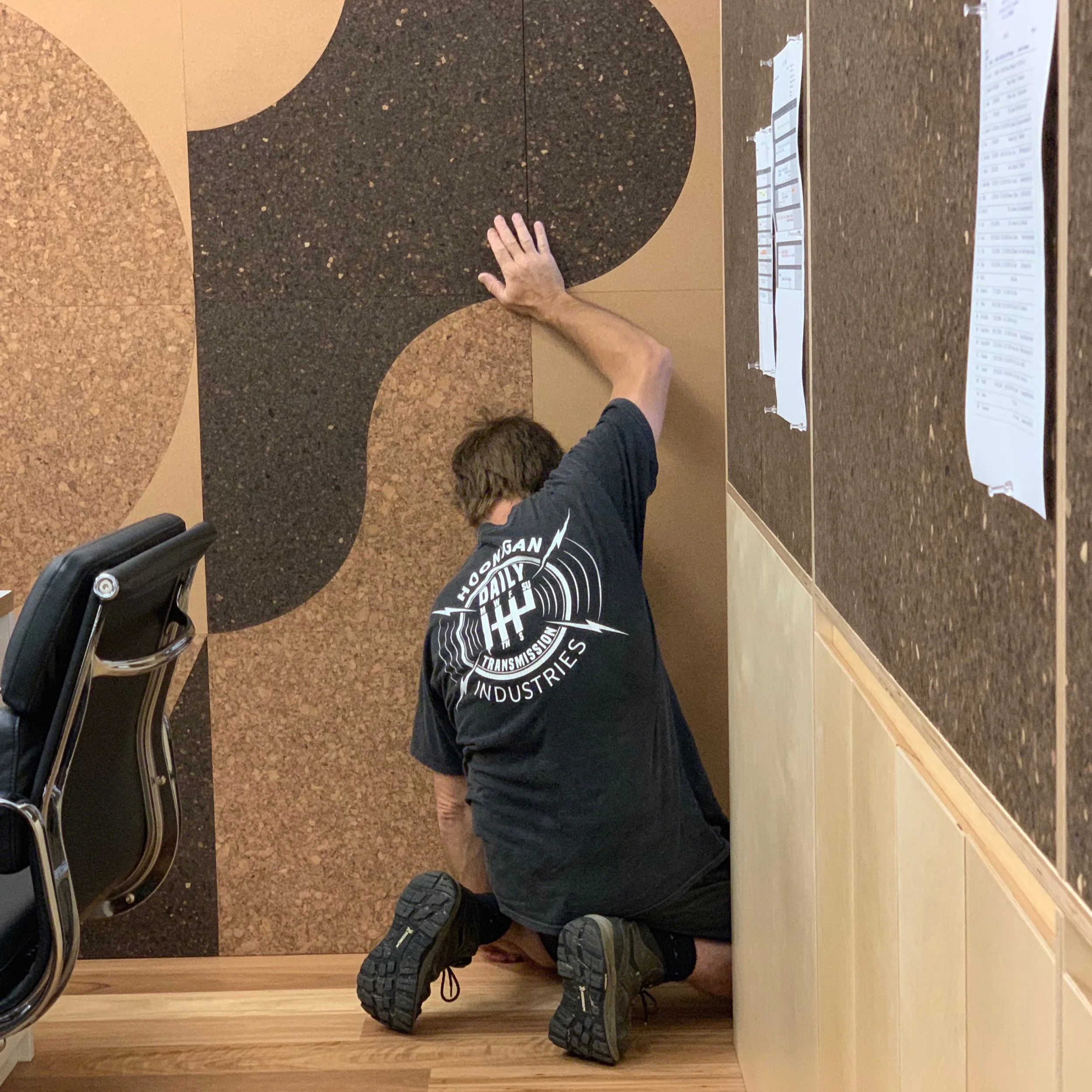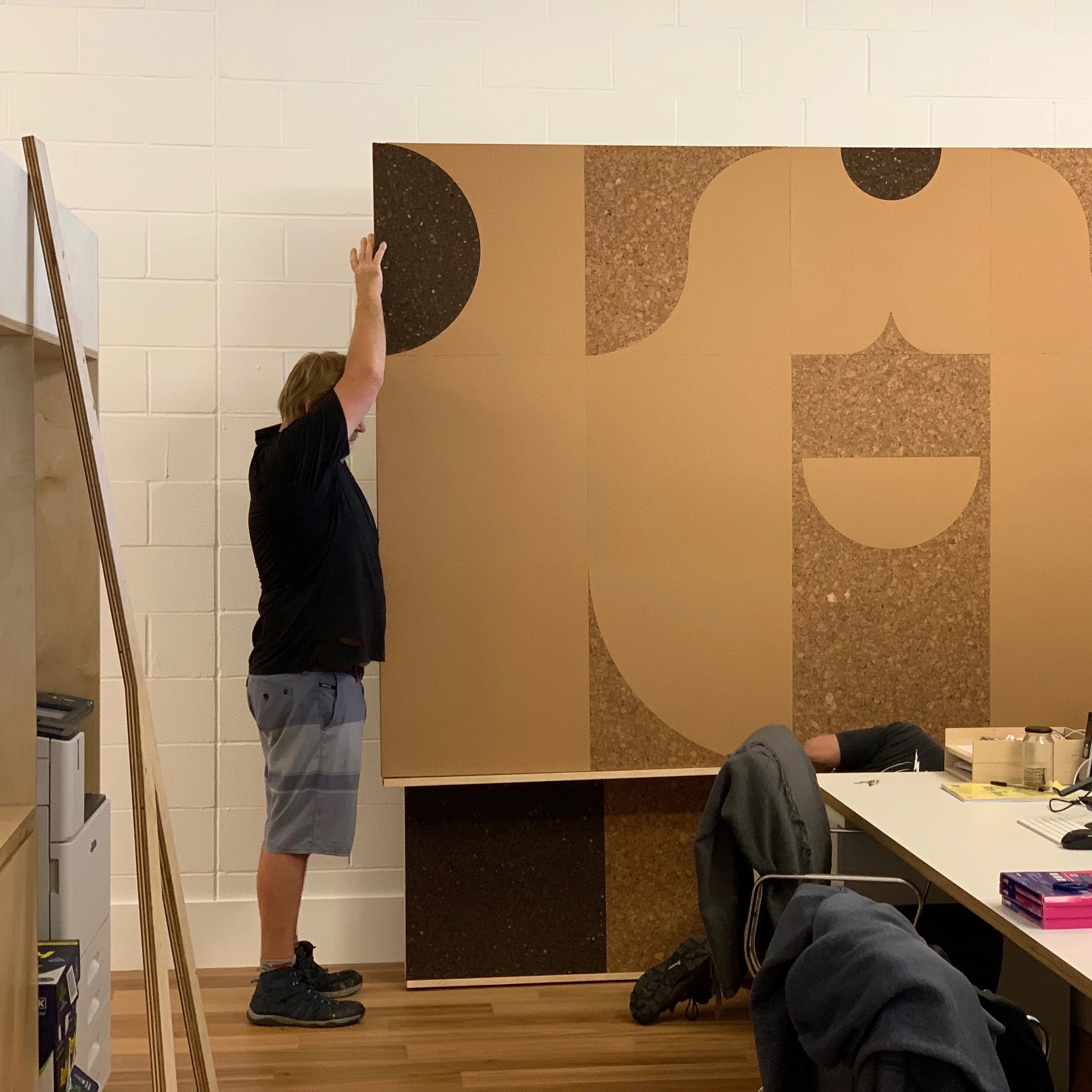 Riffing on the spirit of the company, we worked with production co. Photoplay to muralise their new office. Made from three cork colours, it acts as a sound baffle, pin board, and gigantic cool thing.