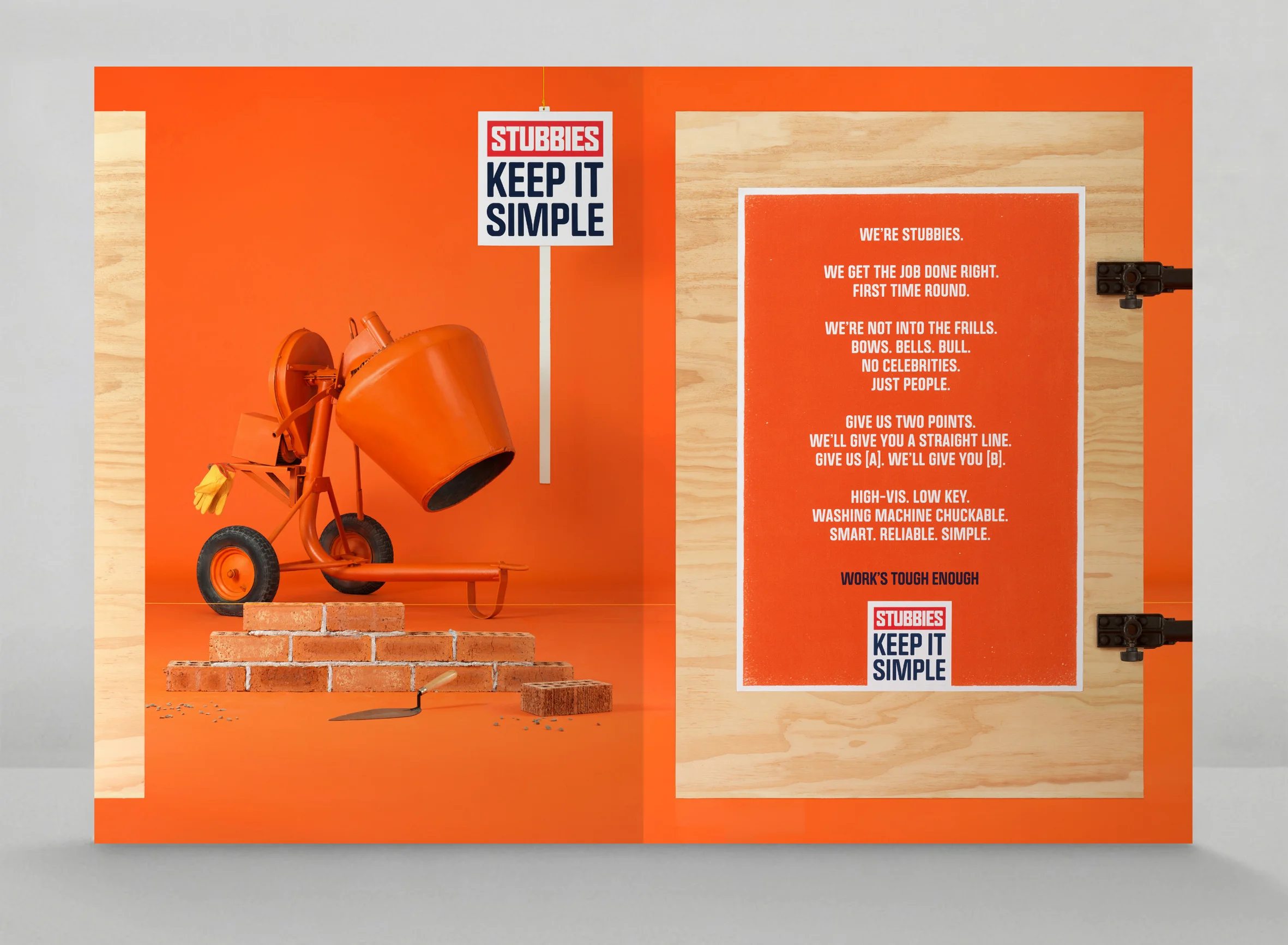 Best known for their 70’s icon the men’s short short, Stubbies continues to produce no-frills, no bullshit clothing for straight-down-the-line Aussie Tradies. And with the ethos Keep it Simple, we knew exactly what to do with our art direction.