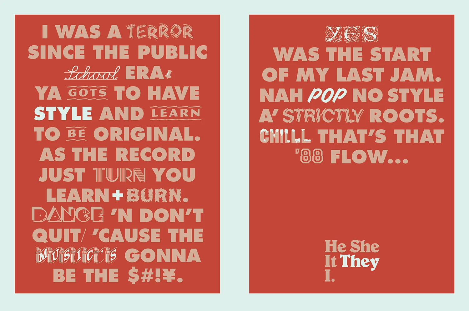 Dave used free, and pretty corny, fonts found online to typographically illustrate lyrics suggestive of the golden era of hip hop—specifically 1988.
